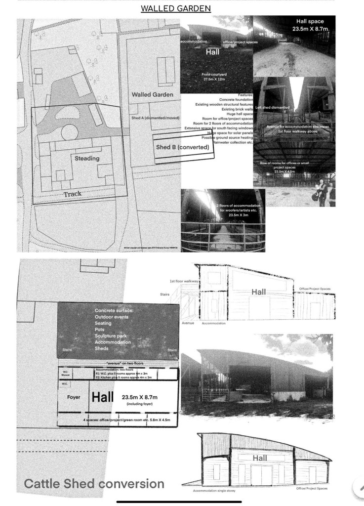 About three years ago I was given the opportunity to reimagine the cattle sheds (and the walled garden). At this point I had little knowledge of permaculture, and had newly arrived in Scotland with music still at the forefront of my mind and career, hence I tried to imagine something ostentatious and slightly ridiculous (and ultimately unnecessary) as a solution; something that would have required some big budget funding. In any case, the sheds were still in use by the farmers (up until only some months ago), the pandemic arrived, and ideas of creating performance venues in the middle of nowhere suddenly felt even more ridiculous! Nevertheless, the latest ideas do still have a clear genetic connection to these older plans. Arguably these could be designated as “version 1.0”, but in software terms, these are probably more akin to “version 0.1”; some kind of alpha stage of software development – full of bugs and inconsistencies!