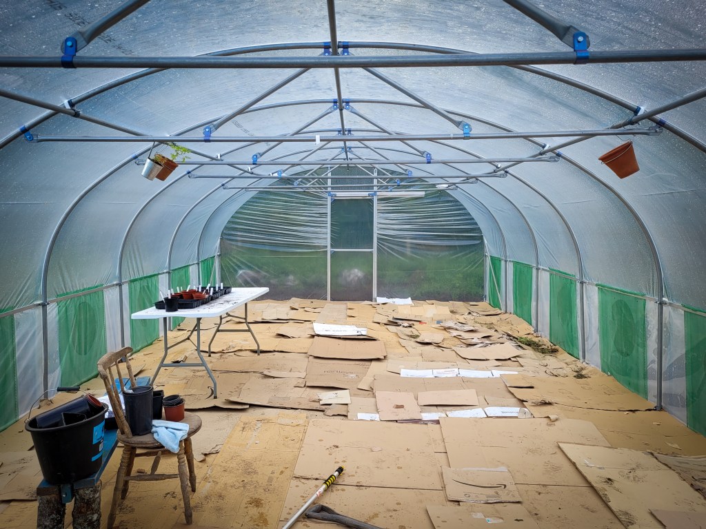 A surprisingly massive amount of cardboard was laid down to cover the entire 16ft x 35ft interior, and a pile of compost was to be dumped on top in narrow strips, with wood chip then spread onto the pathways in between.