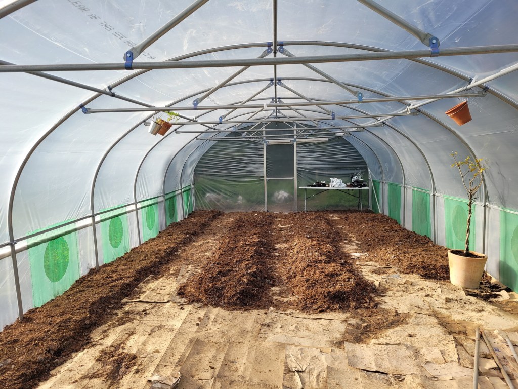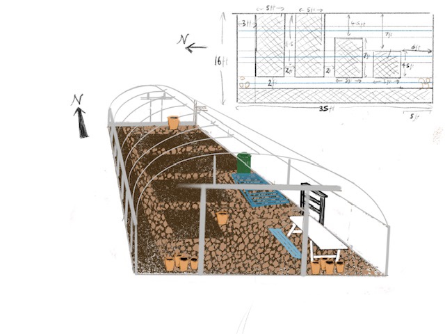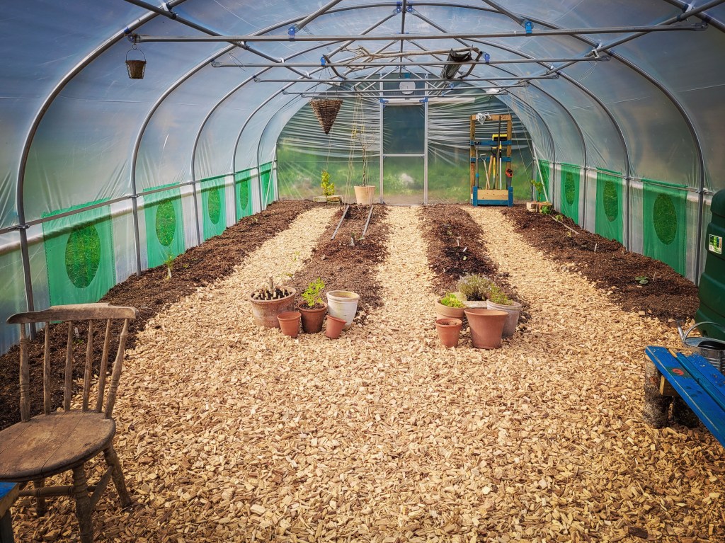 Having read various articles, posts and books about polytunnels, I settled on emulating a simple idea that I had personally encountered in a lovely looking tunnel from (Permaculture Design Course tutor) Carole Egner’s project in Fife. One of our PDC weekends involved a site visit there, which generously included the permission to binge on all the copious amounts of the various salad leaves present on that early April weekend.