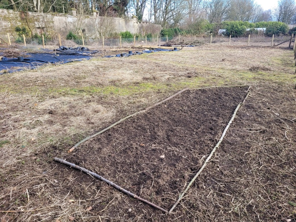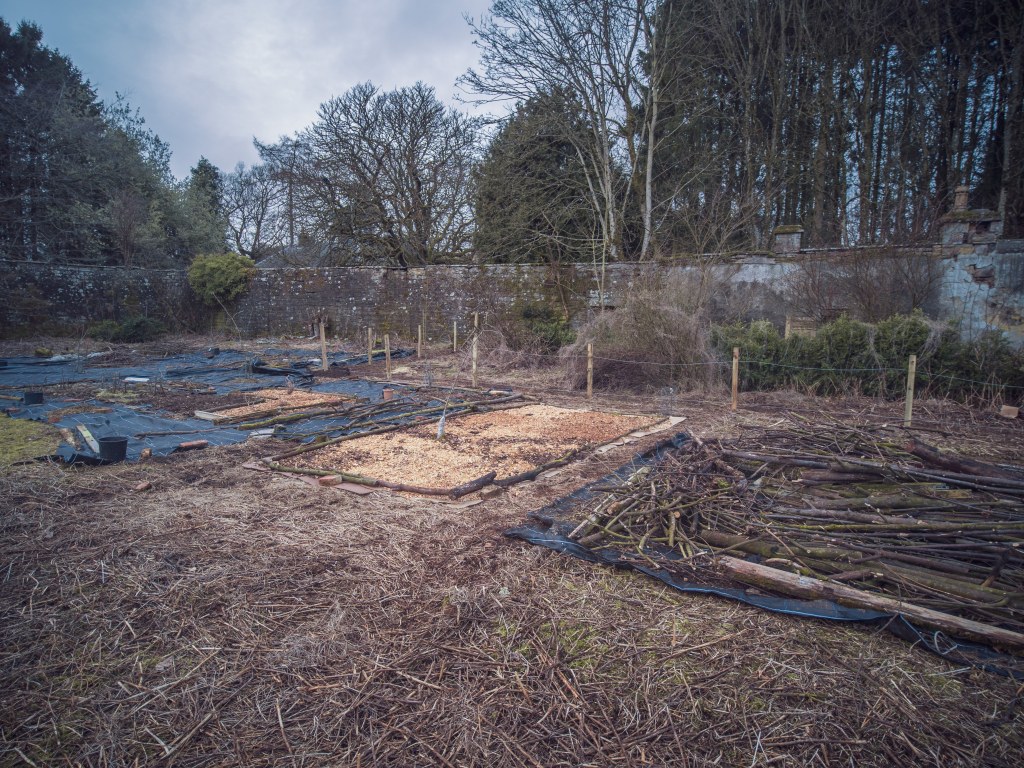 In January huge amounts of brash (sticks/branches etc.) from previous years cleared sycamore and red berried elder (and last year’s fallen poplar) was finally dealt with – mostly dressed (trimmed with a billhook) and neatly placed into piles for further consideration. With some also piled onto the already existing prototype hugel-kultur style bed that colleagues of mine helped to construct last autumn. Some local people have suggested to me that I should burn it all – but sometimes it’s useful – such as for borders around growing beds, or creating pathways, or maybe dead hedges for wind protection. So I won’t do that.