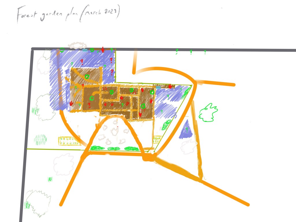 After some trepidation, I finally took the plunge with rabbit proof fencing around part of the “forest garden” area. This was completed in mid-February and helped to bring into a focus a more detailed plan for how this area could progress. But it also raises the questions about how formal/informal the area should ultimately be. I’m leaning towards a slightly more formal version for the plan of this area now, and the fencing has inevitably helped to enhance that. But at the same time, some chaos and unpredictability is welcome; the books of Masanobu Fukuoka and Anni Kelsey reinforce the relatively more recent gardening trends (though is most applicable to a form of forest gardening), as a habitat that humans are only one beneficiary, and that “pests” and “weeds” should be sometimes welcomed alongside our preferred species. But the rabbits were so vicious in their destruction of my initial plantings, that I had little choice but to fence them out, otherwise it would have been an uphill struggle getting anything started, unless I wanted a garden of solely nettles, ground elder and rosebay willow. With an ambitious rewilding project happening just over the wall, it doesn’t feel appropriate to take the “do absolutely nothing” approach here, especially as one of the main aims is to ultimately provide multiple ways of producing food (for humans). To recreate something like a “forest floor” with edible perennial plants and fruits and berries requires some intervention here, especially if one is in any kind of a hurry to achieve it. Aside from regular scything, coppicing self seeded sycamores and removing some red berried elder, I’m avoiding any other form of habitat destruction.