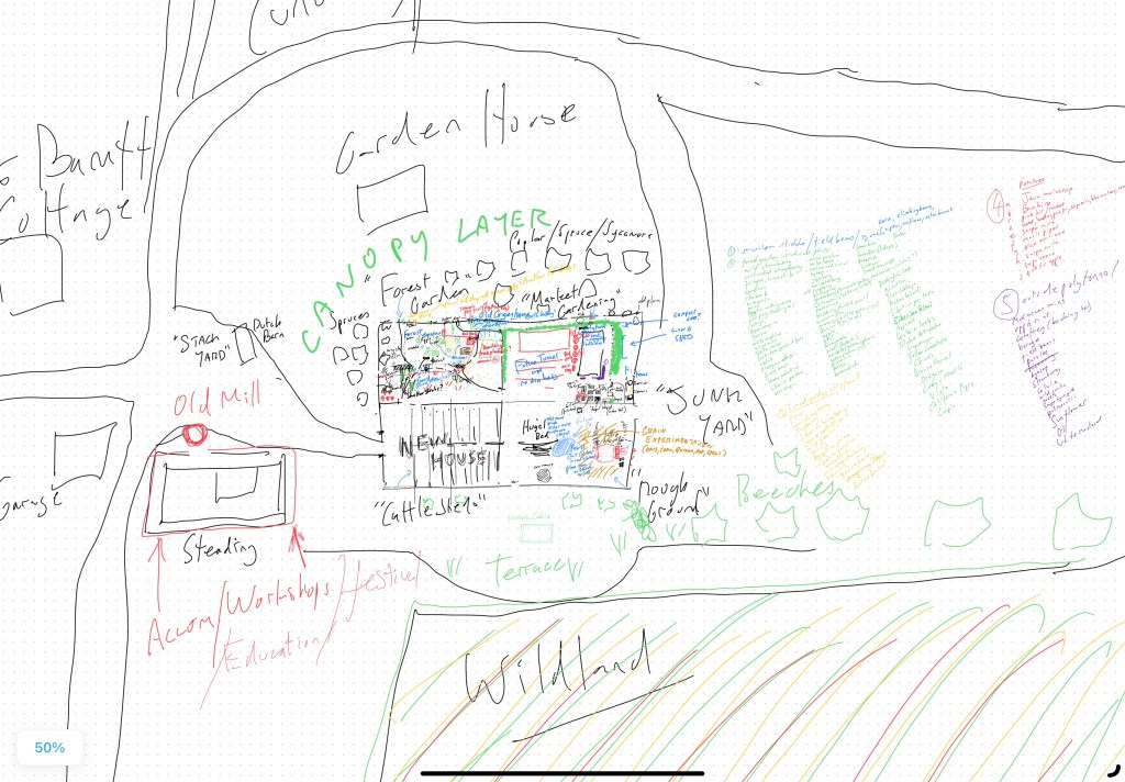 This expansive whiteboard document can, in its original form, be zoomed in and out of – adding small details on the micro level, or larger objectives on the macro level. The walled garden itself is here divided into its four already obvious quadrants. The “forest garden” in the north-west. The “market garden” in the north-east. The “rough ground” in the south-east and the “cattle sheds” in the south-west.