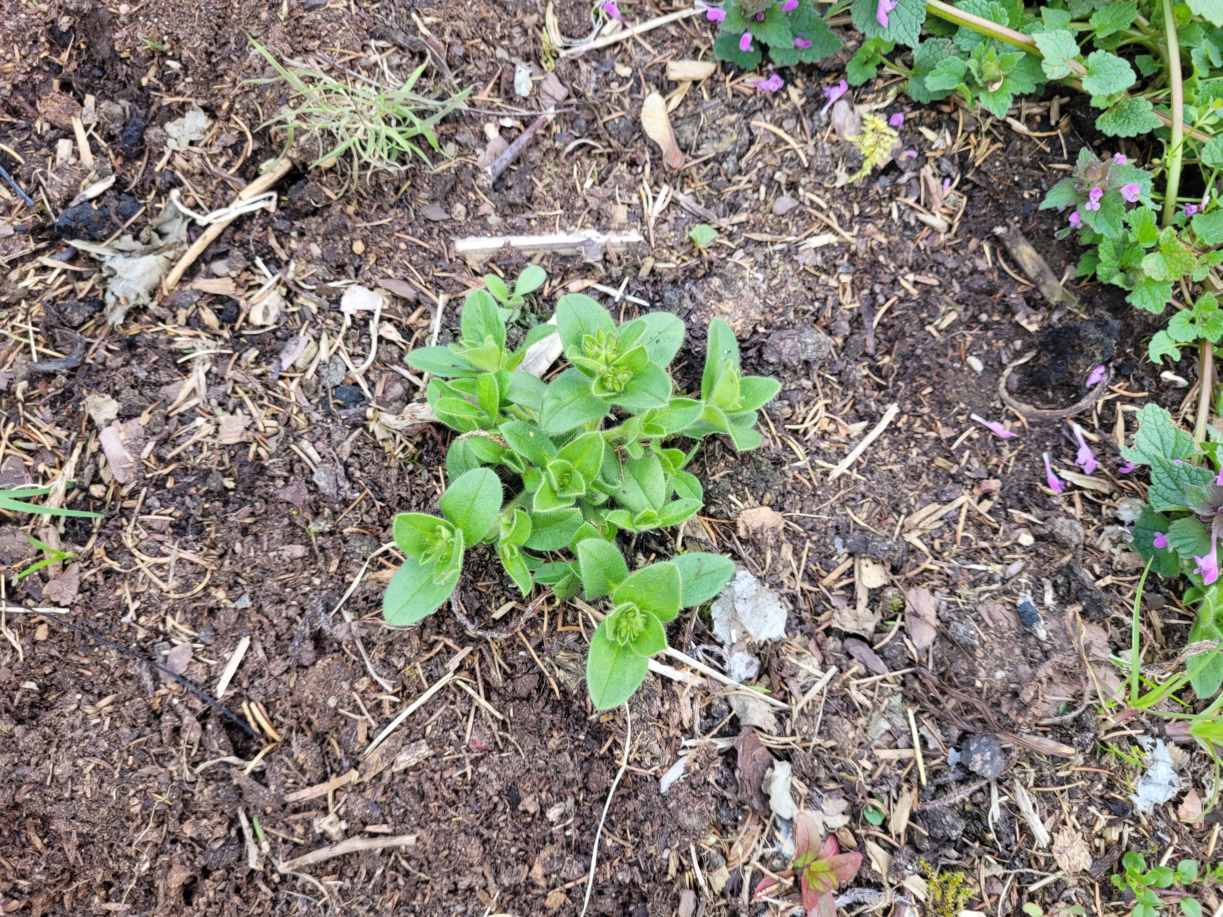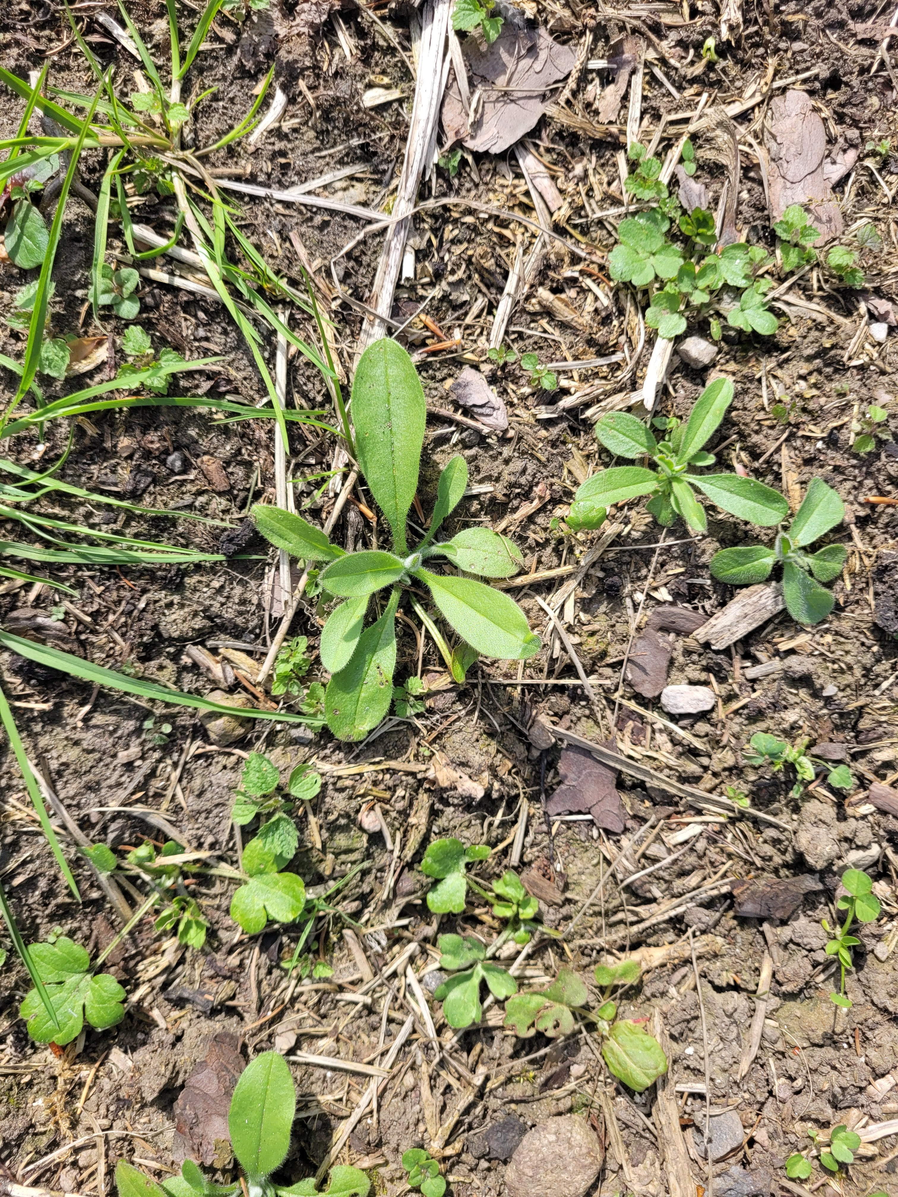 Hence regular casual hoeing – focussing mainly on rosebay willow, cleavers, buttercup, dock and nettle is currently occurring. But this is casual rather than meticulous, so some will possibly establish themselves, though hopefully only in limited amounts. Other weeds such as forget-me-not, dead nettle and mouse eared chickweed are left largely to their own devices. Then there are numerous others which I simply don’t recognise yet, and am mostly leaving those too. Apart from those tiny low growing micro-white flowered things whose name I have forgotten and which are usually just pulled out by hand. However, this approach may turn out to be unmanageable, as previously dominant weeds may once again take over. And so, rather than weed the garden every day forever, I may need to revert to some kind of suppression – probably cardboard or maybe even corn starch mulch sheets, plus some woodchip. Alternatively, perhaps the fast spreading wild strawberries and mints might instead win out. Or maybe the mexican marigolds may clear an area entirely alone…