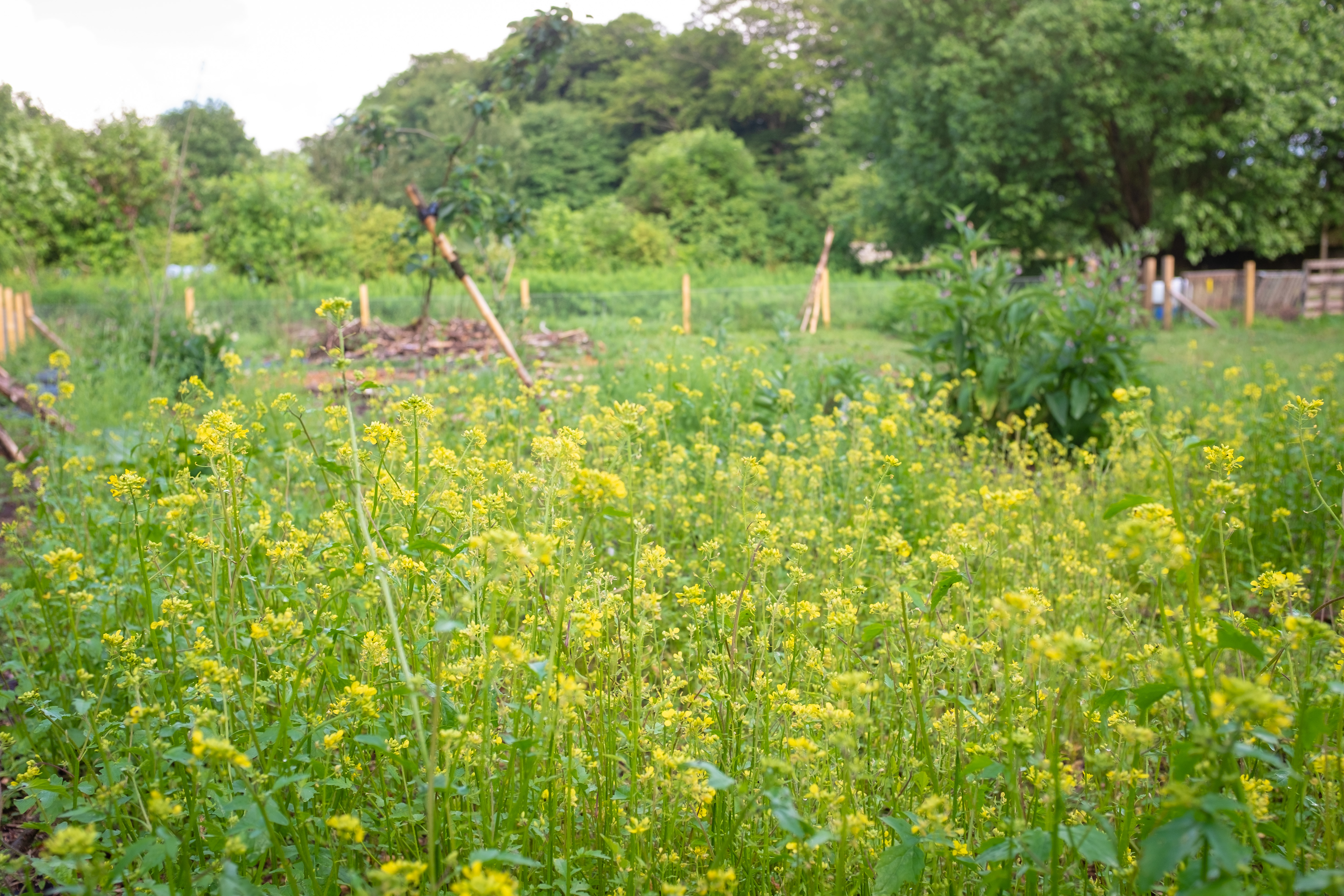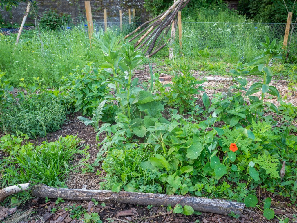 Speaking of sowings, my daughter Flora helped to sow wildflowers and also some of the generous bags of “green manures” seeds that I bought in February/March, and which have mostly since germinated; with spectacular success particularly for white mustard, vetch and field beans. I like to forget that they are specifically marketed as “green manures” – and instead enjoy their colours, structures and their massive contribution to both ground cover and delicious foraging and I expect that these will become a permanent feature in future years, especially as many will self seed. But the impressive expanse of these flowers and foliage give a quick-fix “illusion” that a garden has been quickly constructed – though in reality, various perennials have only just been planted or sowed relatively sparingly.