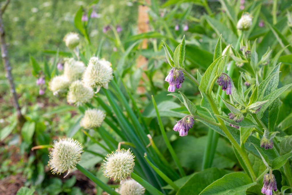 Wild and cultivated strawberries, different varieties of loosestrife, cardoon, globe artichoke (from seed), rhubarb (transplanted from elsewhere at Bamff), wild and non wild garlic, walking onions, bocking 14 comfrey, lovage, rose campion, ginger mint, perennial kale, lesser celandine (transplanted), Siberian purslane (transplanted), winter purslane (from seed), welsh leek, red veined sorrel, hyssop (transplanted), jostaberry, worcesterberry, wild raspberry, blackcurrant, whitecurrant, four types of gooseberry, honeysuckle, sedum, pulmonaria, horseradish, lemon balm, potentilla, scabious, sweet woodruff, babingtons leek, minutina, asturian tree cabbage, climbing kiwi, applemint, walkie leeks, chives, bronze fennel, oregano, wild pansy, lupin…