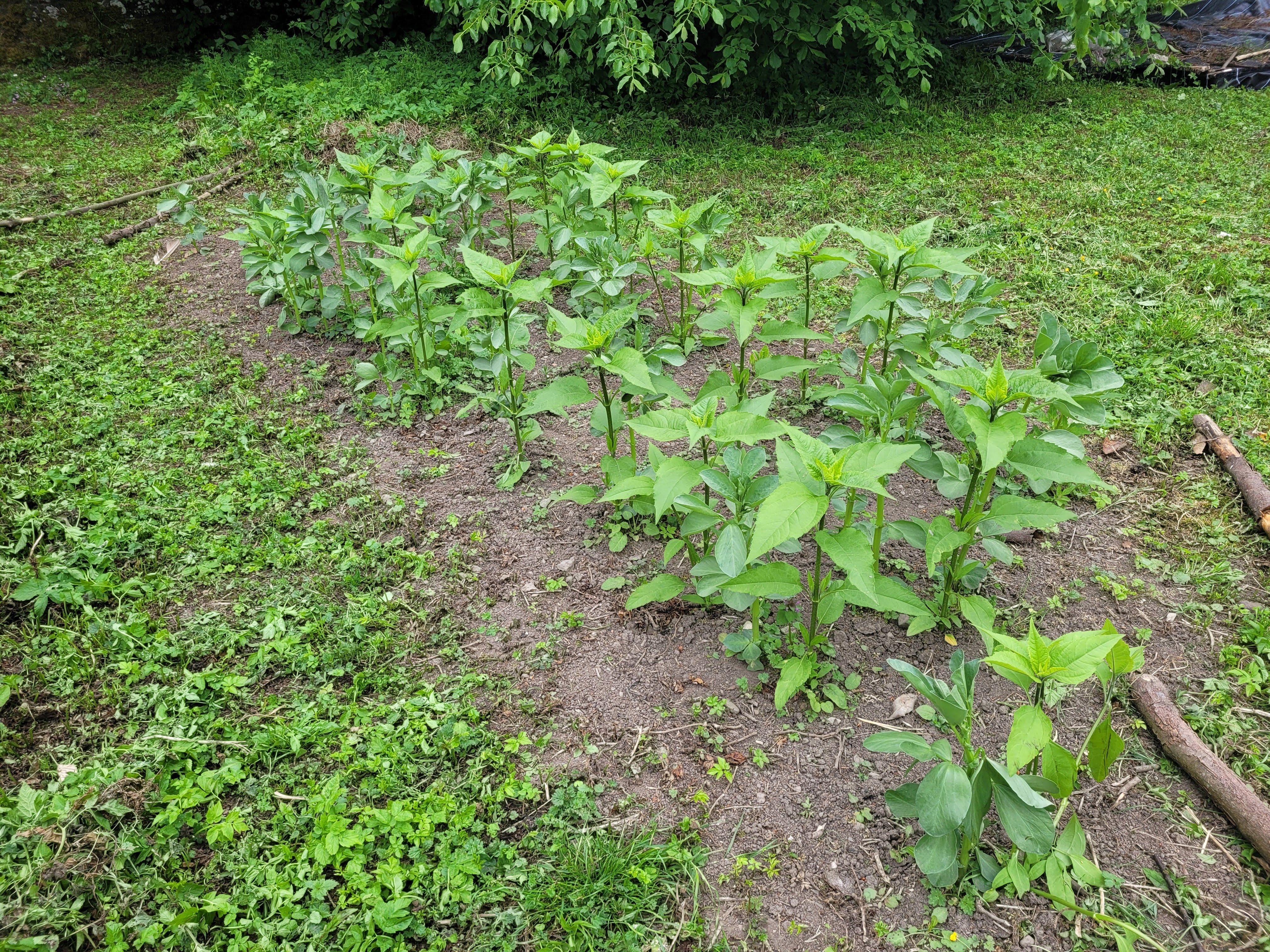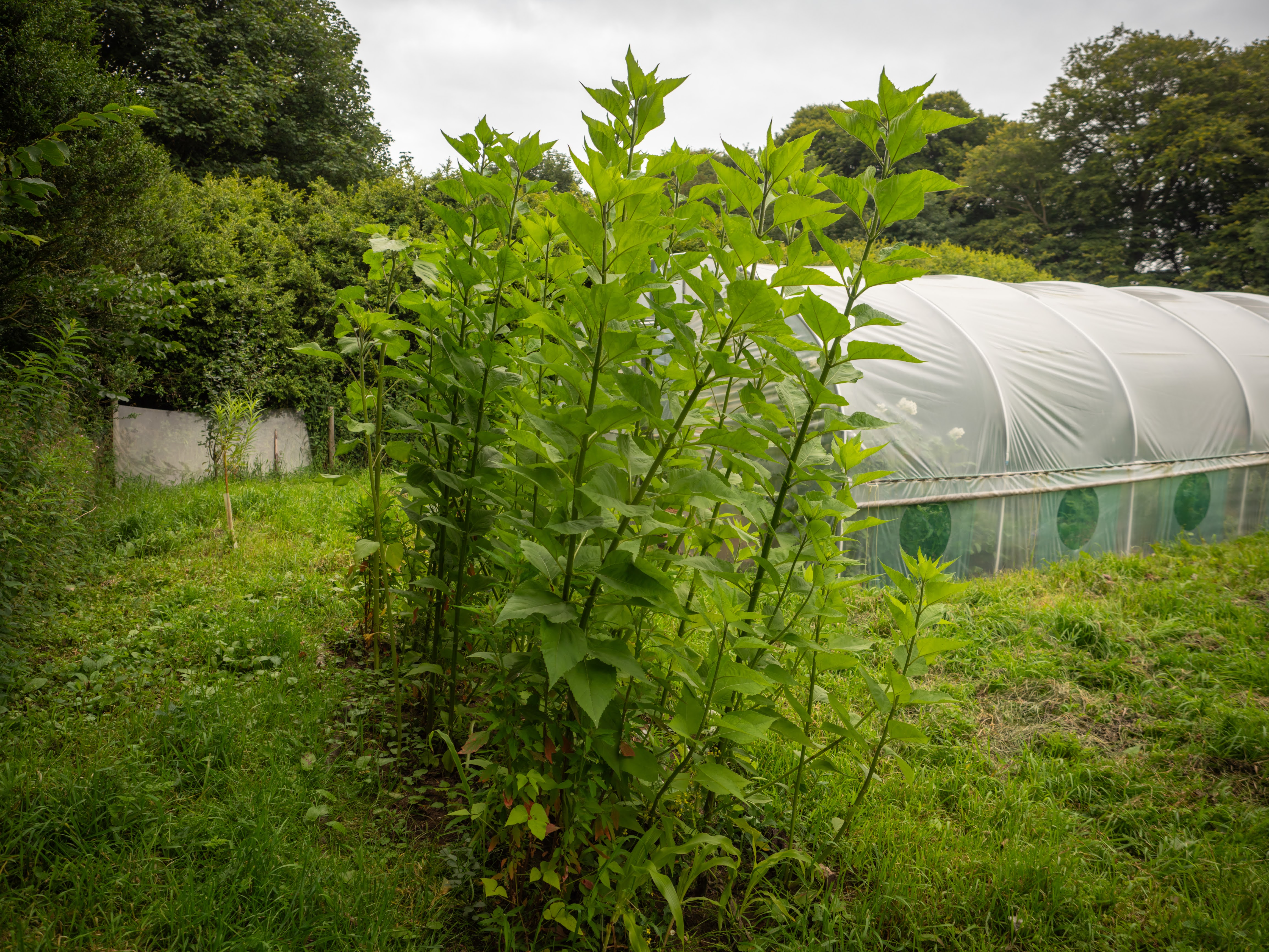 The much lampooned Jerusalem Artichoke was quite a revelation! Planted in three randomly created beds that were previously home to dense weed populations or grasses, cleared and then planted with the tubers and the (very successful) field beans in late winter (plus the unsuccessful winter squash varieties, in an attempt at a kind of “three sisters” planting). Not knowing what to expect at all, I was stunned to see that they all eventually erupted into towering sunflower like stalks (they are relatives) that didn’t produce any flowers at all, right up until the very first frosts arrived in October, when suddenly dozens of mini sunflower like flowers appeared on the end of their stalks, though by this time they had also been mostly blown down in strong winds. Harvests of these tubers (which are of the fuseau variety) were staggering in number. And as of the time of this post in late December, still only about half have been harvested – and even then, still many are left in the ground for next year. So, even though some may avoid these vegetables for certain…turbulent reasons, I’m extremely pleased with their possibly eternal presence, not least because their flavour is simply divine! With some staking, they can also becoming effective windscreens (haha) for any other plants that need some protection. And in fact two areas of planting, south of the forest garden, have the potential to spread further and become part of a system of windscreens that may help plants to the north, as strong prevailing winds are often funnelled through the wide west garden entrance and up into the forest garden. This may become of extra importance in the future once the old cattle sheds are dismantled.