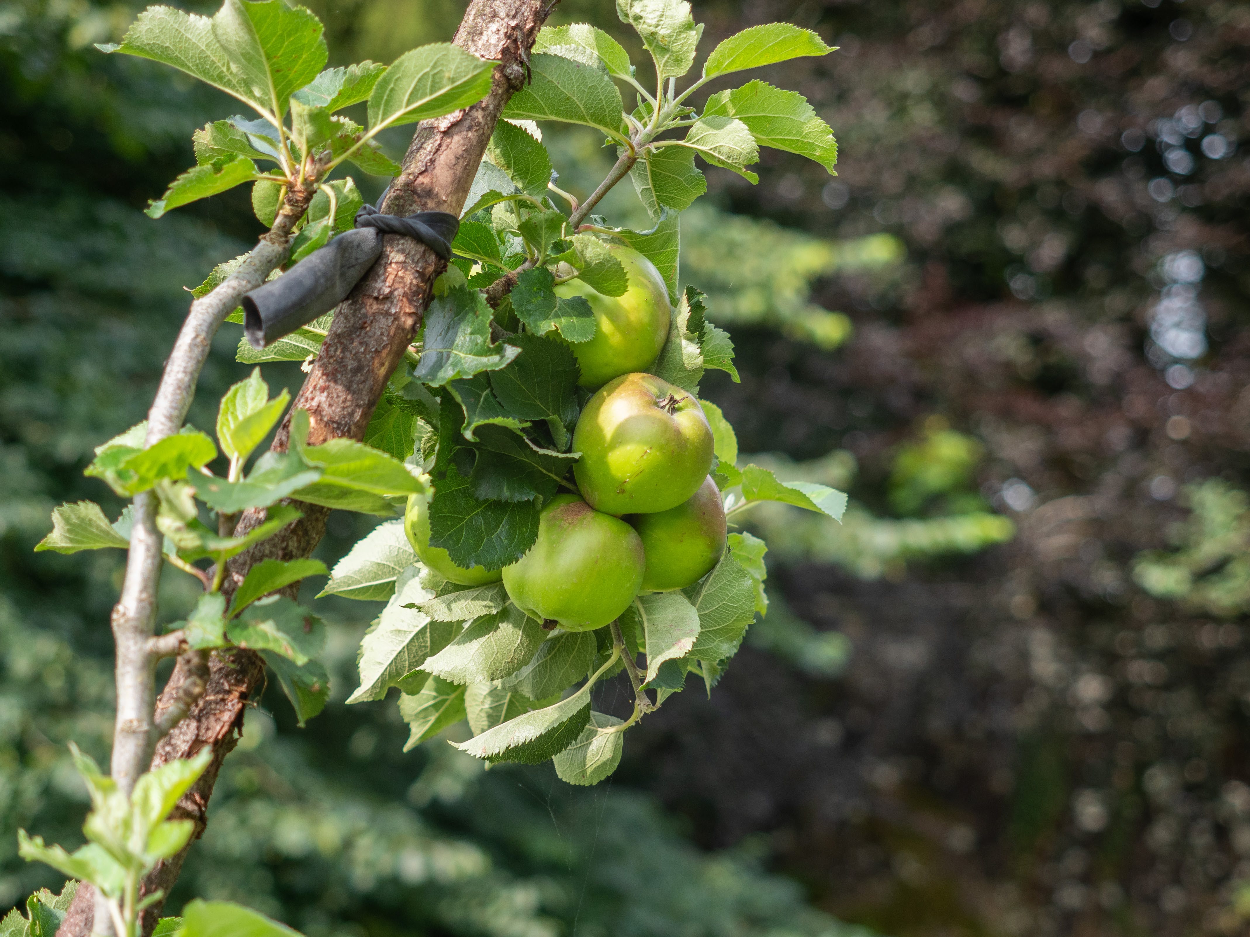 Elsewhere in the forest garden, the young fruit trees took a slightly disappointing turn. Initially it looked like the existing six small apple trees, planted in November 2021, would produce over 70 apples between them, but most were either blown off the tree, or eaten by birds. Others had fruits too heavy for some branches, and various attempts at supporting them didn’t work out quite so well. Then one of the ring-barked rabbit damaged trees finally gave up altogether, though it has a second life with a shoot thrusting vertically from above the rootstock joint. I’m now nurturing them as well as I can, protecting their bases, mulching, pruning and making sure they are well supported.
