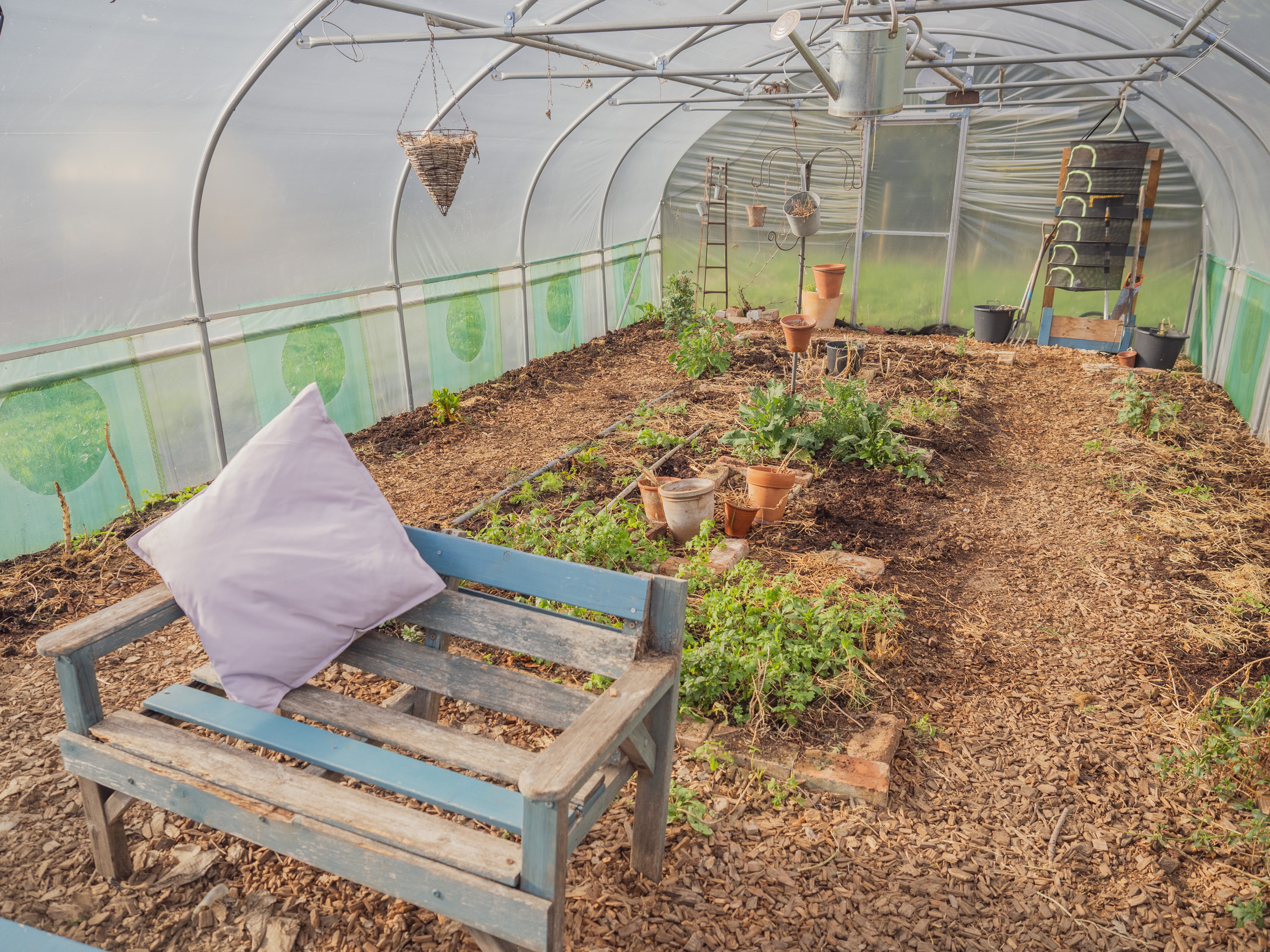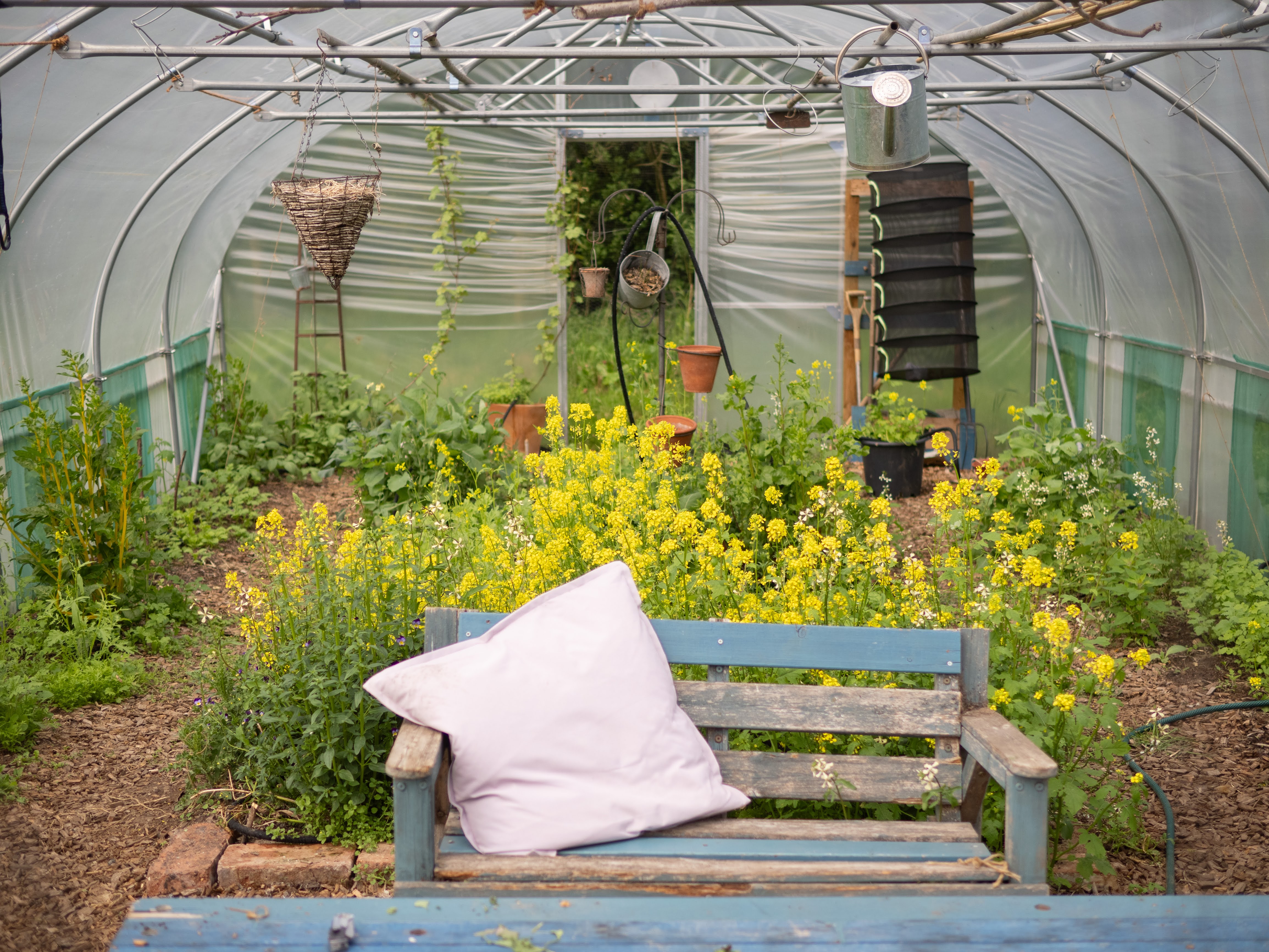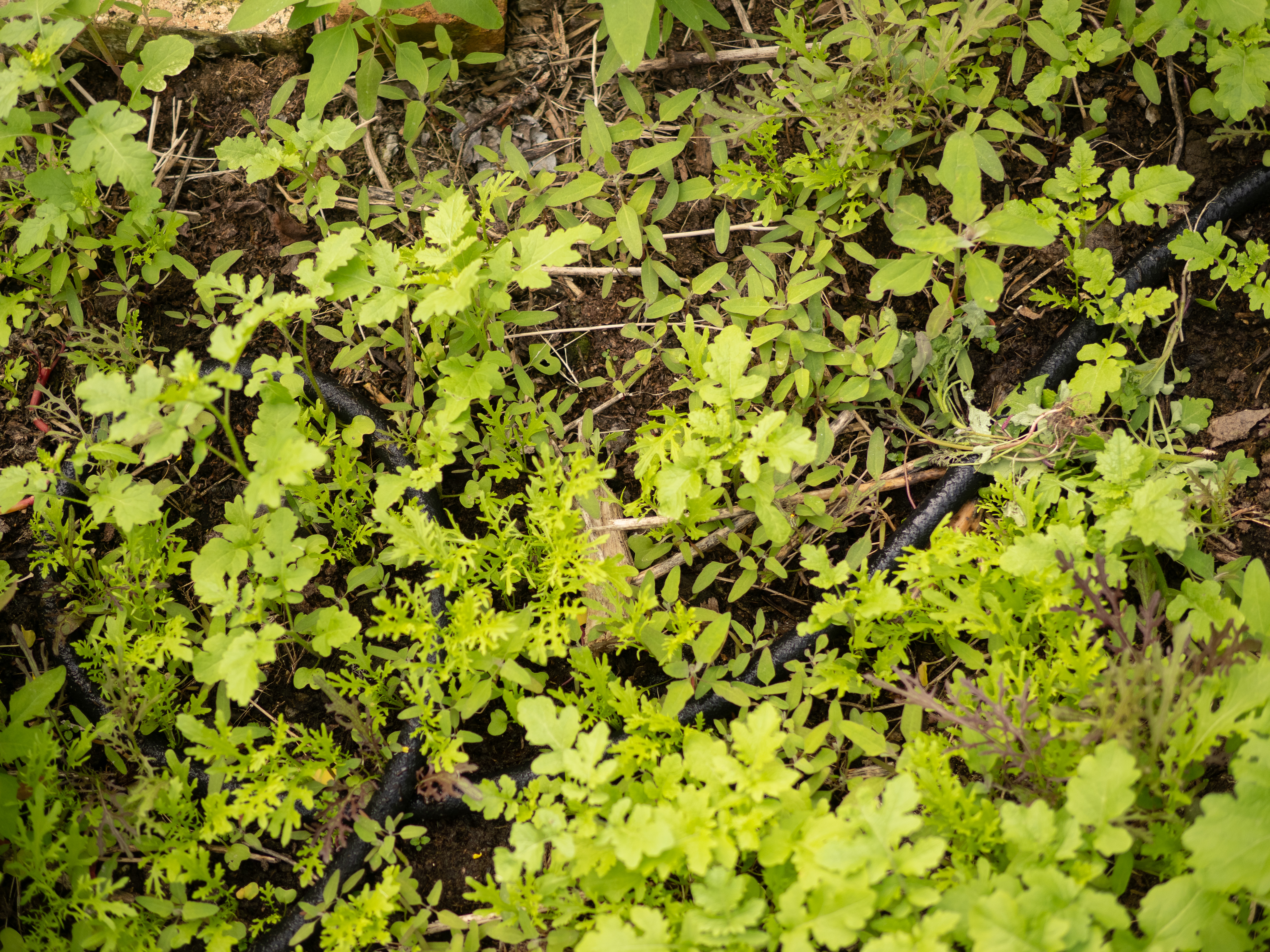 Another aspect of “invasion” was much more positive. I found myself revelling in the self-seeded annuals in the polytunnel—particularly rocket, various types of mustard, dill, Aztec broccoli, and mizuna. By opting for a drip hose as the main method of re-wetting the dried-out overwintered soil, these plants erupted everywhere, suddenly providing a bounty of greens from March onwards. I might have allowed this to go on a bit too long… but nevertheless, it felt somehow right that the vegetable-growing zone of the garden also had the possibility for some kind of self-willed, sustainable growth. Next year, I might be a little less overzealous, perhaps, particularly with the Aztec broccoli, which is by far the most dominant self-seeding plant, and which I harvest only a small proportion of (mainly the leaves when they are younger, for their pleasant pea-like flavor).