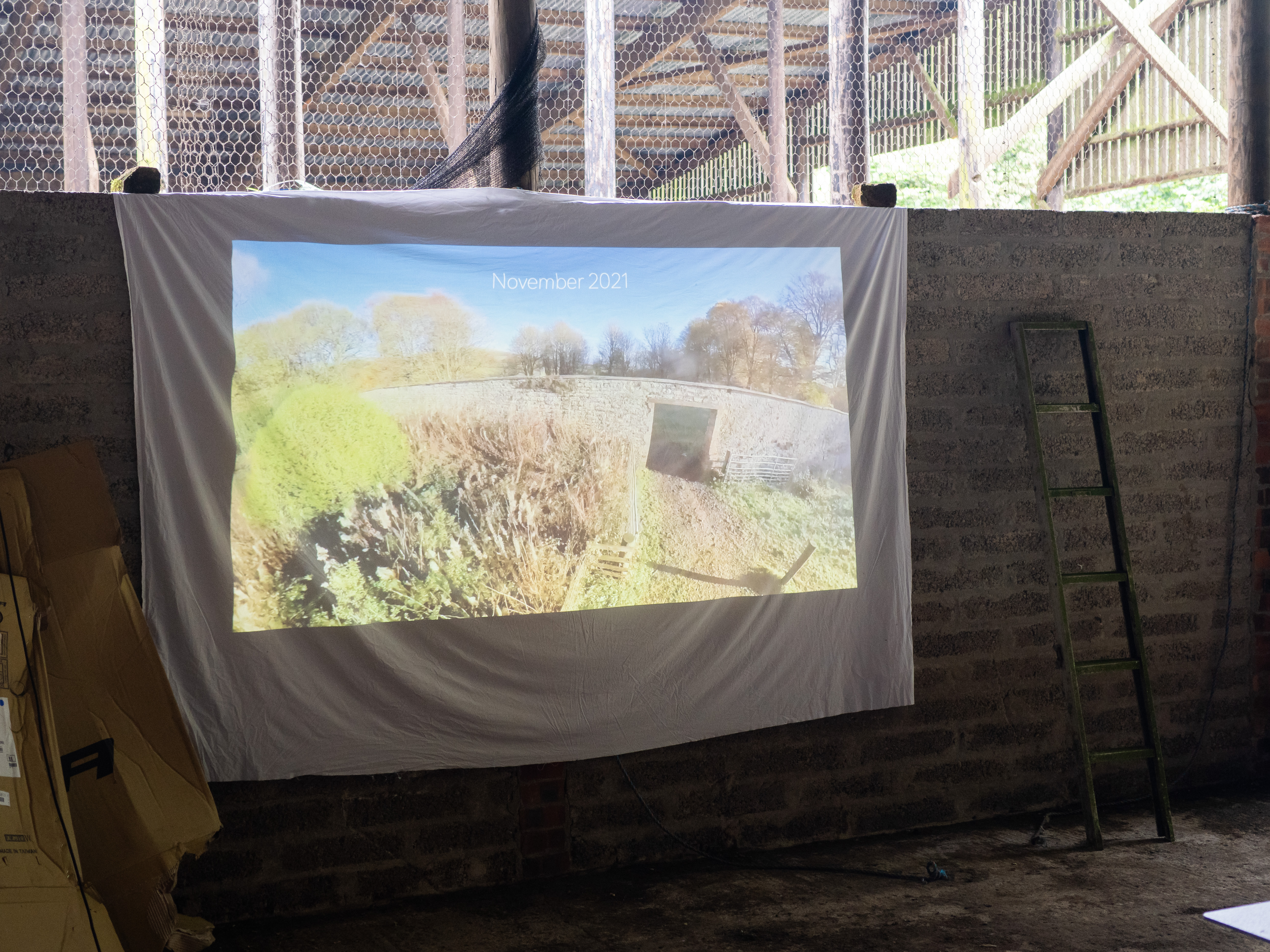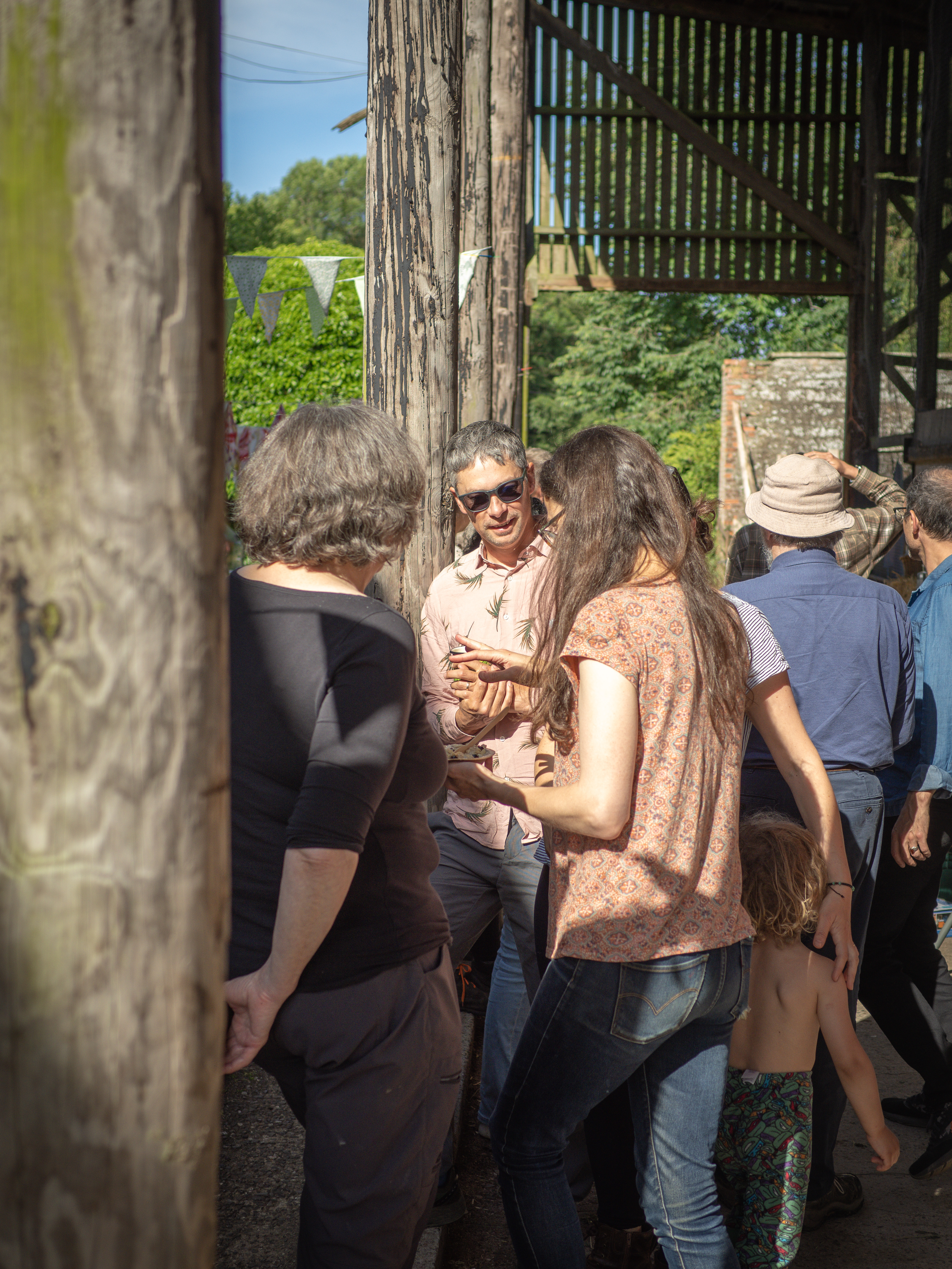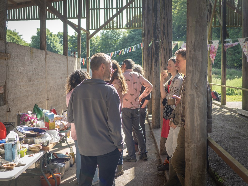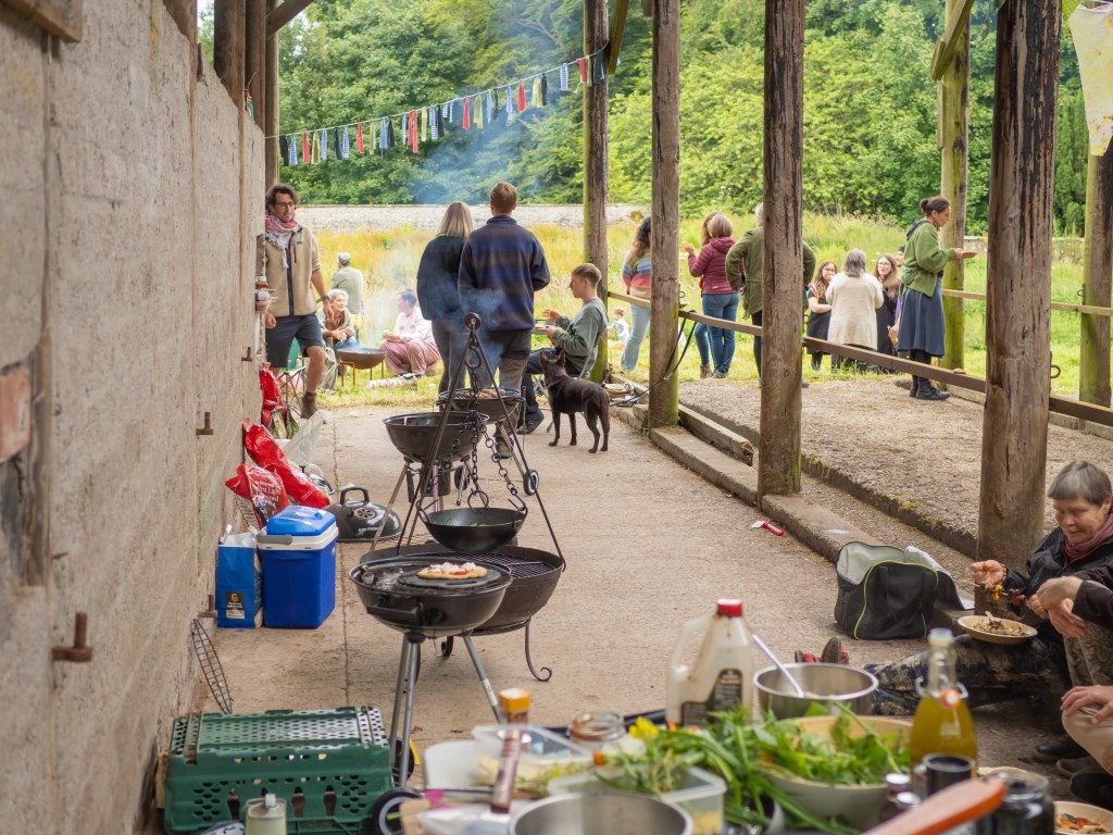 Invitations were sent out slightly at the last minute, and it took some time to get the garden “ready,” with particular focus on the cattle sheds, which required a massive clear-out and cleaning. This would be the primary space where most of the gathering would take place. Nevertheless, locations around the Walled Garden were also highlighted—places to sit in the forest garden, the polytunnel area, the rough area to the southeast, plus a bell tent set up for children to enjoy. Camping was designated on the terrace to the south of the garden. A music playlist was curated, food ingredients were prepared, bunting was hung, and two video projectors added a multimedia element alongside an audio PA system.