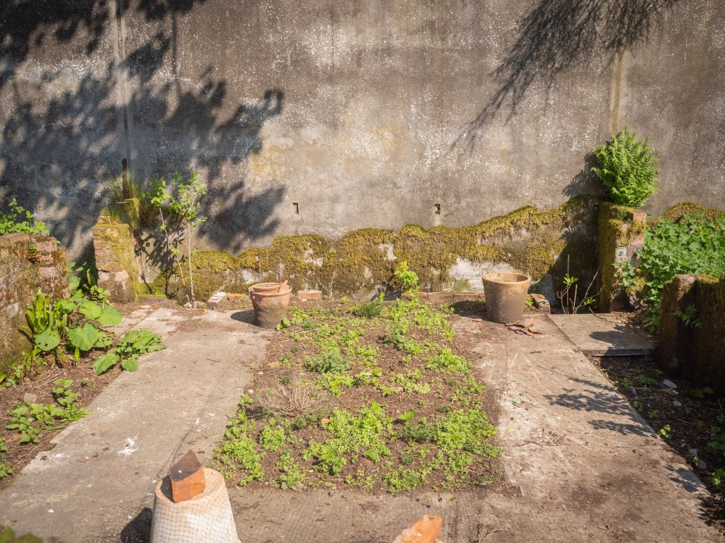 In the spring, I decided to tackle this area, at least in a preliminary “phase one” effort. The central sector of the greenhouse site was entirely cleared. Huge amounts of glass were removed (though plenty more remains, waiting to be uncovered), the invasive species were addressed, and with some spade and brush work, I uncovered a concrete base that covers around half the original footprint in a horseshoe-shaped arrangement—visible for the first time in many years.
