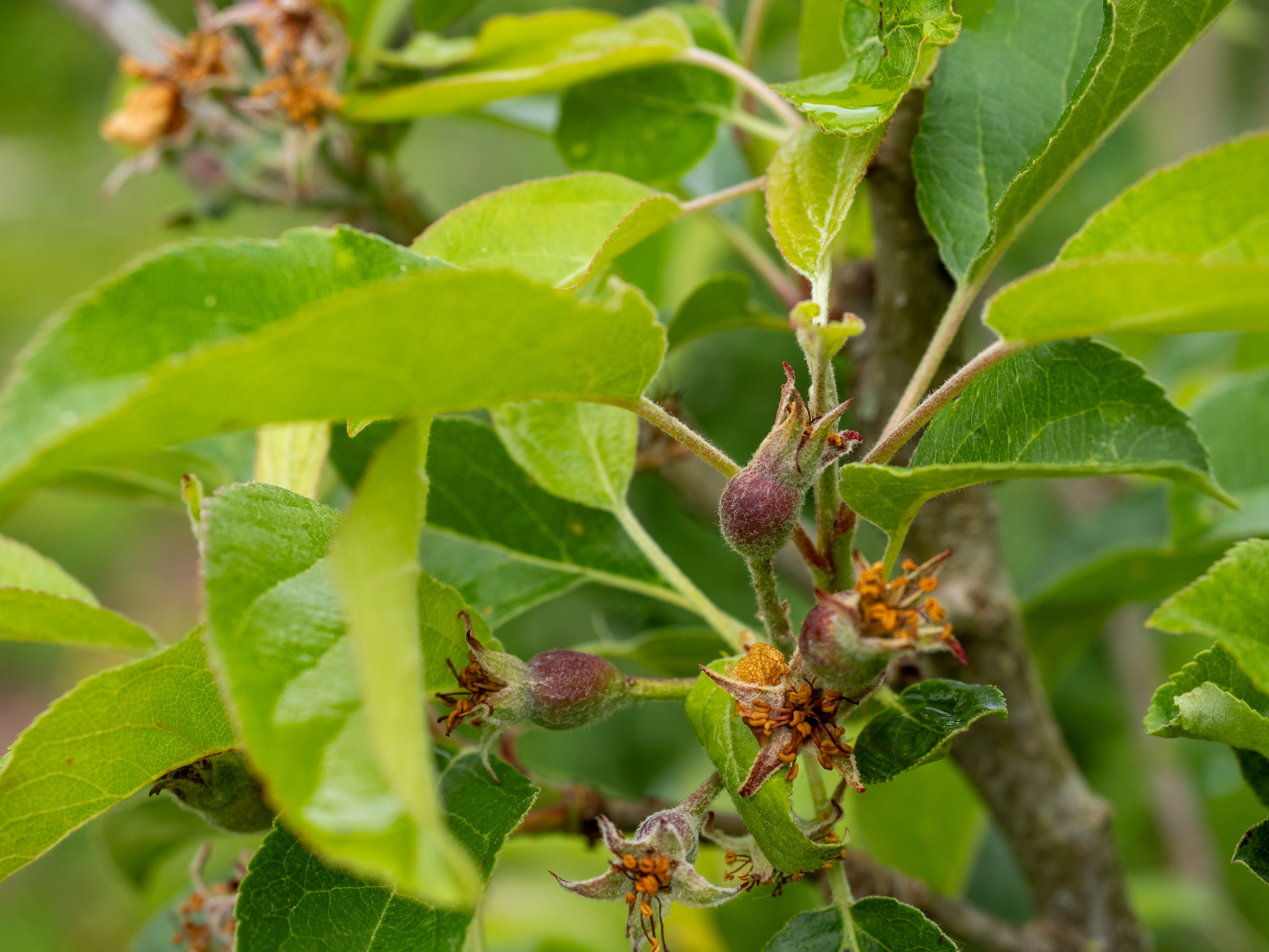 In the winter of 2021, five apple trees were planted here – amidst a horrible ocean of plastic mulch sheets, now long gone. The following year they yielded thirteen apples between them. In 2023 and 2024, around seventy. This year, it’s looking more like two hundred.